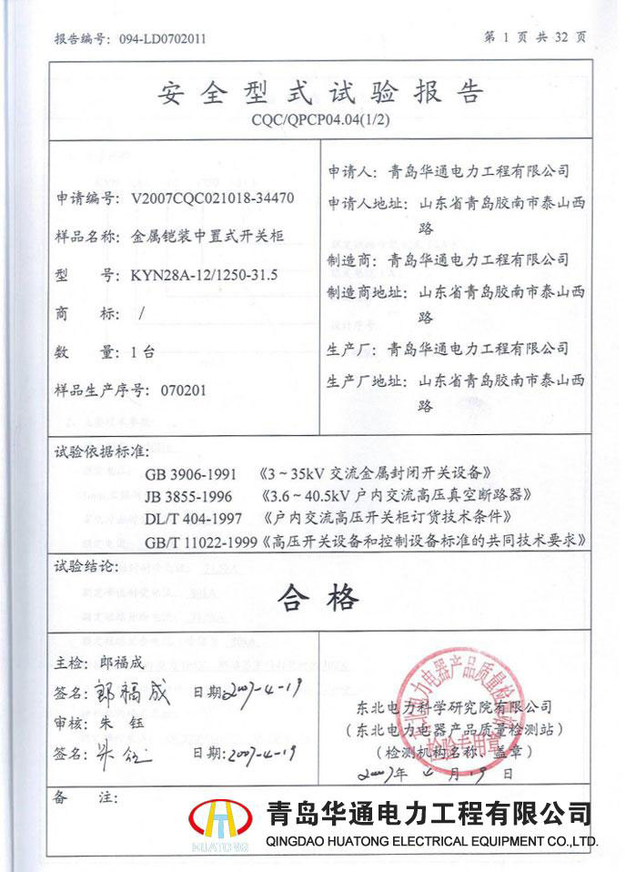 KYN61-40.5高壓開關(guān)柜型式試驗(yàn)報(bào)告